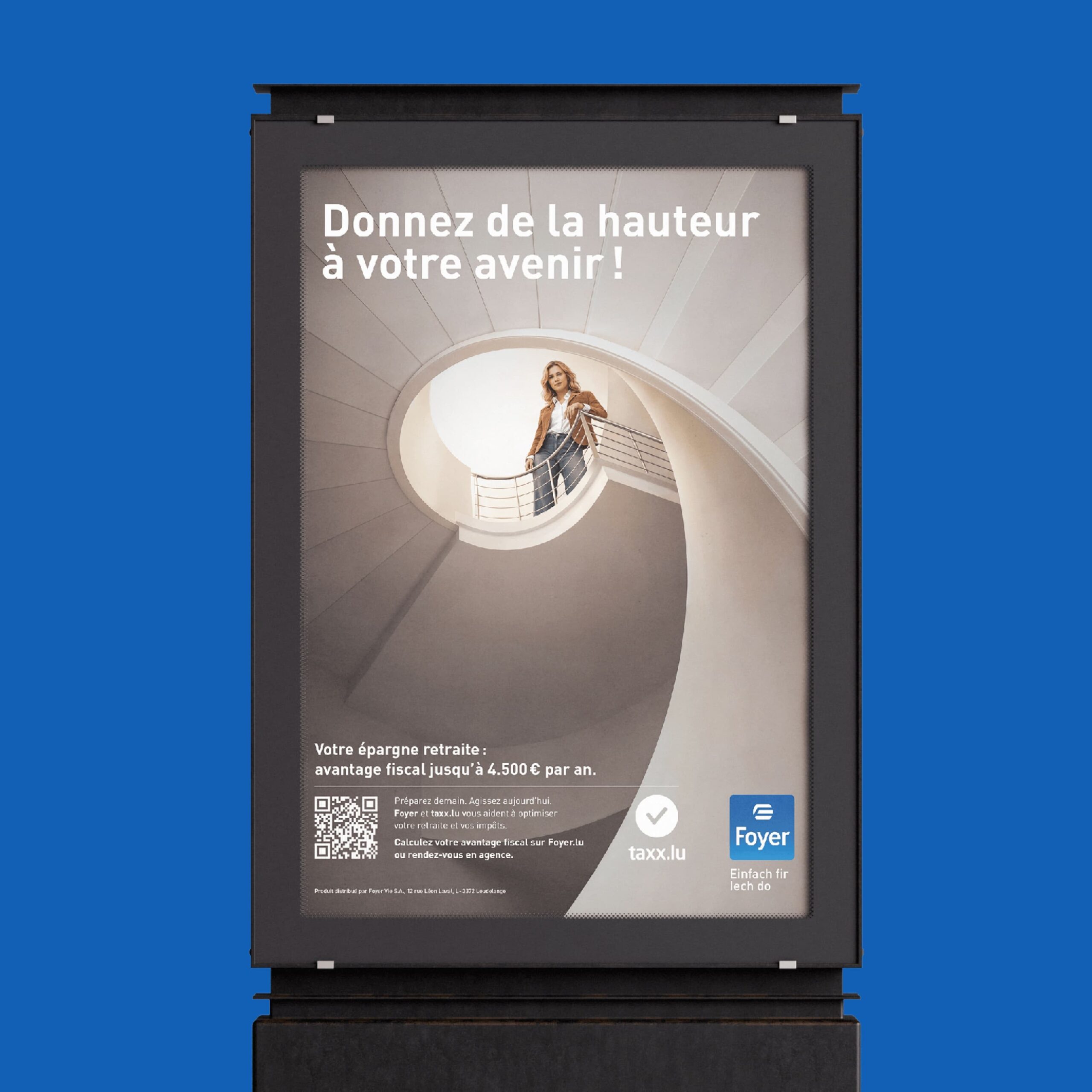 Un dispositif centré sur un visuel unique simple et impactant mettant en avant le nouveau plafond de déduction fiscale, complété par la valorisation du simulateur fiscal développé par Foyer et du partenariat avec taxx.lu pour accompagner les clients dans leur déclaration et optimiser leur situation.
