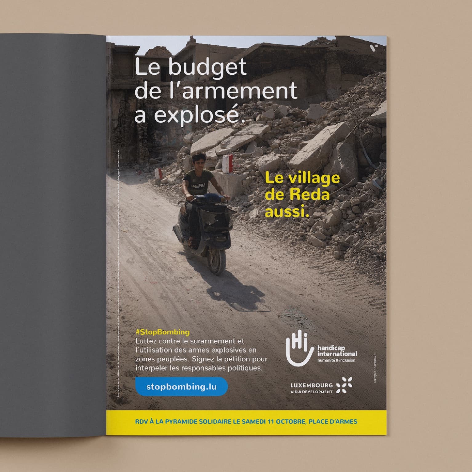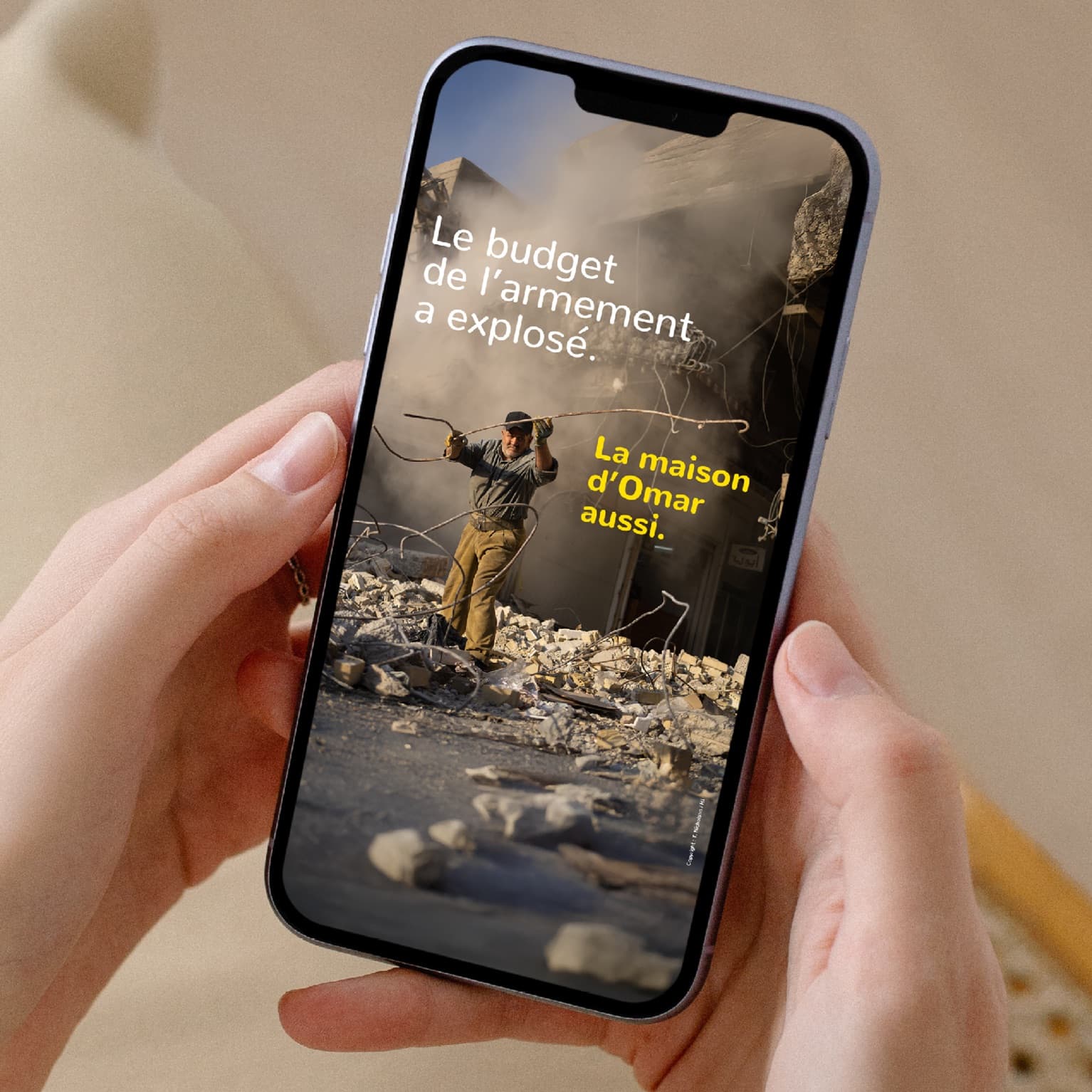 Une campagne visuelle choc, qui met l’humain au centre. L’absence d’effets spectaculaires souligne la gravité du message : il ne s’agit pas d’armes, mais de vies. Un ton sobre, une image forte, pour provoquer la réflexion sans détour.