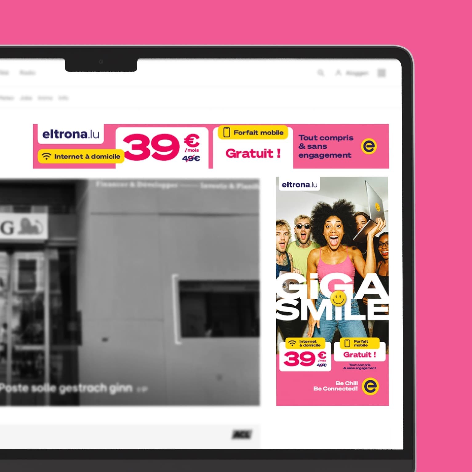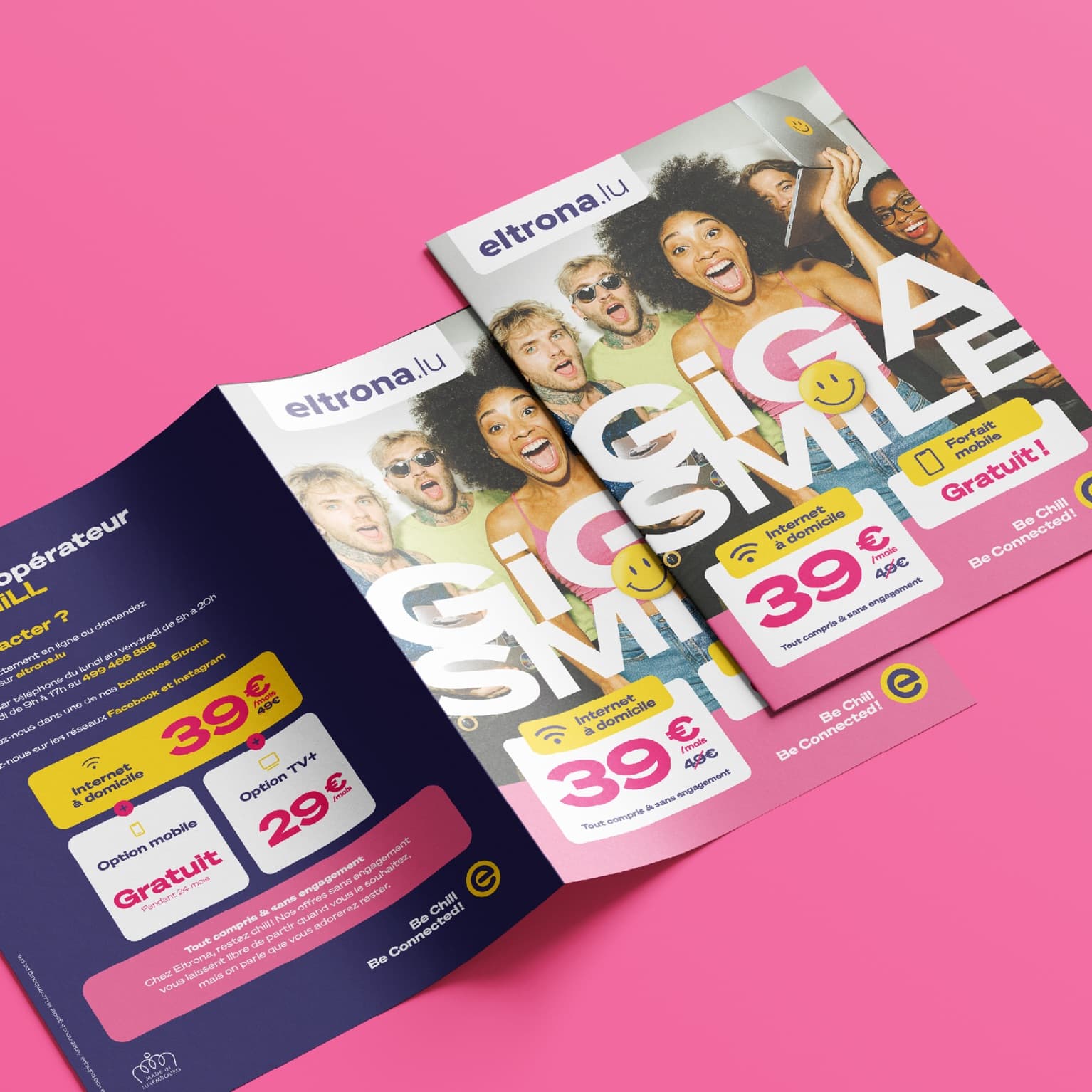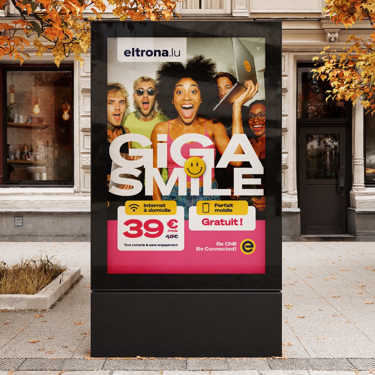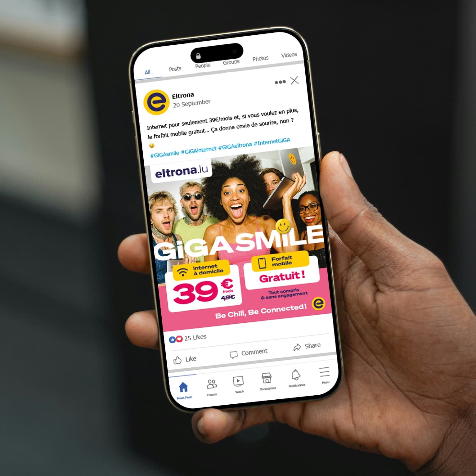 Avec GiGA Smile, Eltrona met le sourire au centre : une offre internet et mobile performante qui rime avec bonne humeur, convivialité et simplicité.